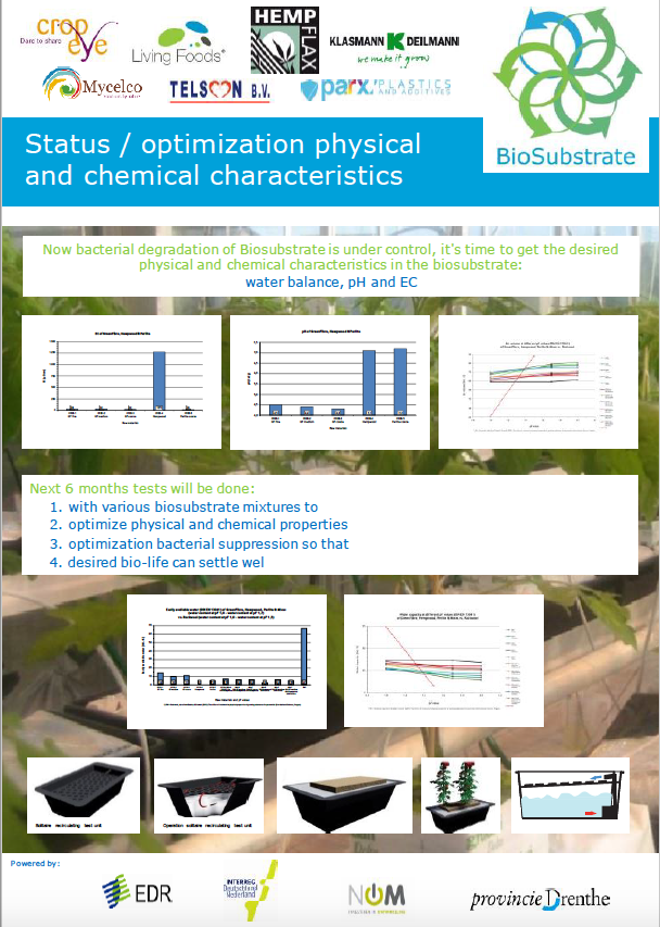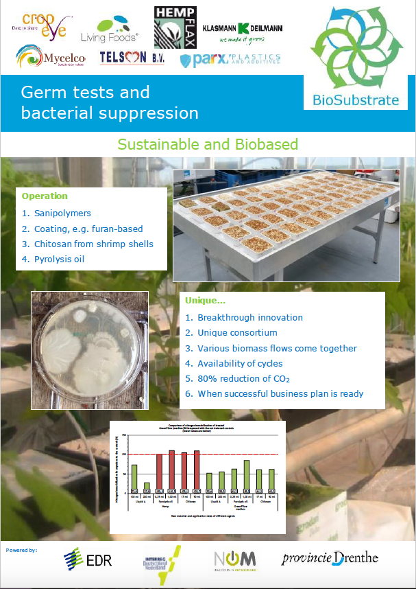 Voorbereidende experimenten door Telson bv, Living Foods bv, HempFlax bv, Parx Plastics bv en CropEye hebben veelbelovende effecten aangetoond van een bepaalde fractie uit pyrolyse olie, van een coating met geïmmobiliseerde zink ionen en van chitosan uit doppen van garnalen. Tegelijkertijd is ook indicatief een toets op fytotoxiciteit uitgevoerd. In een uitgebreide proef (december 2015) worden “de beste concentraties” uitgebreid getest.