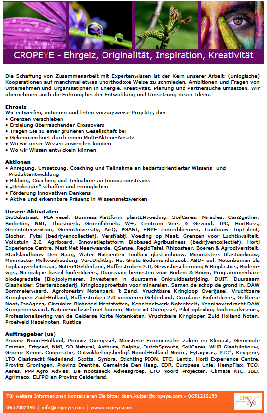 Provinz Noord-Holland, Provinz Overijssel, Ministerie Economische Zaken en Klimaat, Gemeinde Emmen, Erfgoed, NMI, SO Natural, Anthura, Delphy, DutchSprouts, SoilCares, WUR Glastuinbouw, Groene Kennis Coöperatie, Ontwikkelingsbedrijf Noord-Holland Noord, Fytagoras, PTC+, Keygene, LTO Glaskracht Nederland, Scotts, Synbra, Stichting PION, ETC, Lentiz, Horti Experience Centre, Provinz Groningen, Provinz Drenthe, Gemeinde Den Haag, EDR, Europese Unie, HempFlax, TCO, Aeres, PPP-Agro Advies, De Nootsaeck Adviesgroep, LTO Noord Projecten, Climate KIC, IBD, Agrimaco, ELFPO en Provinz Gelderland.