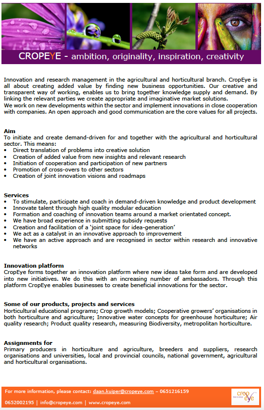 Innovation and research management in the agricultural and horticultural branch. CropEye is all about creating added value by finding new business opportunities. Our creative and transparent way of working, enables us to bring together knowledge supply and demand. By linking the relevant parties we create appropriate and imaginative market solutions.